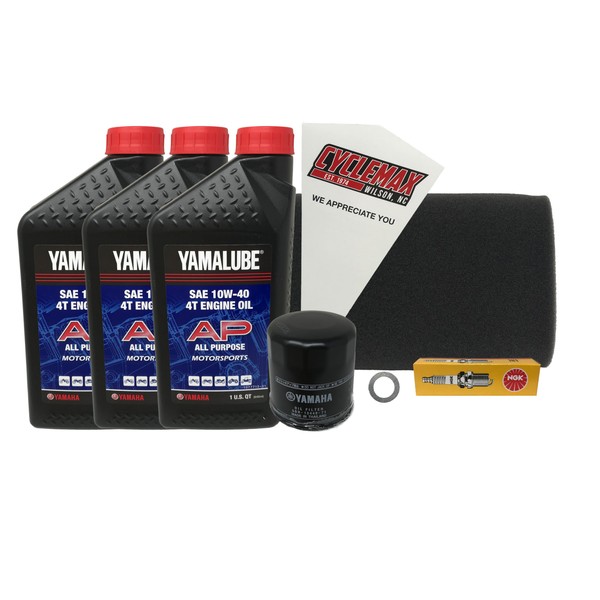 - CYCLEMAX OIL CHANGE KIT INCLUDES: Three Yamaha LUB-10W40-AP-12 Yamalube All Purpose LUB-10W40 Quarts of Oil, One Yamaha 5GH-13440-71-00 Oil Filter, One Yamaha 5ND-E4451-00-00 Air Filter, One DR8EA Spark Plug, One 14mm Drain Plug Crush Washer and a Convenient Disposable Funnel.