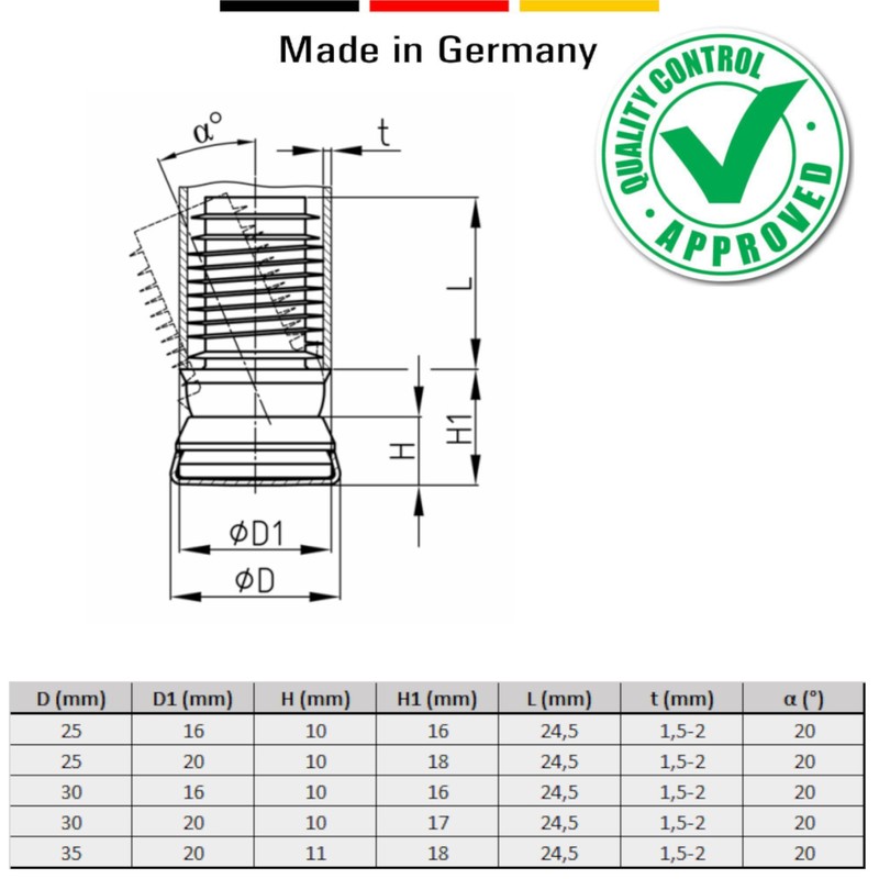 - Please note, please check your measurements carefully before purchasing: D1 = 16 mm (corresponds to the outer diameter of your pipe); D=25 mm (corresponds to the base diameter); T=1.5-2 mm (corresponds to the thickness of your pipe); Suitable for pipes with an inner diameter of 12-13 mm