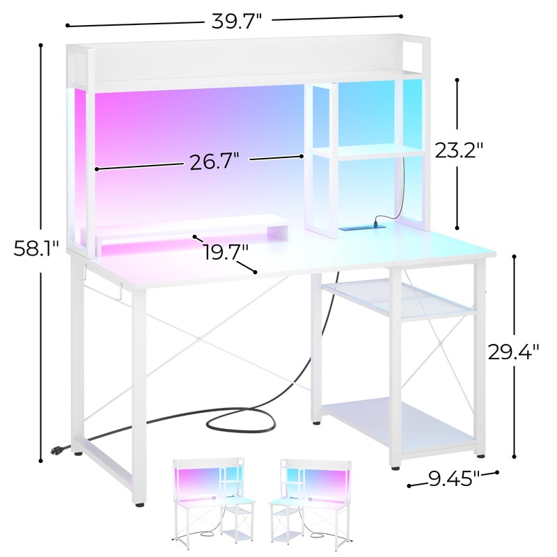 Cyclysio Gaming Desk with Hutch, 39'' Computer Desk with LED Lights & Power Outlets, Home Office Desk with Reversible 5 Tiers Storage Shelves & Monitor Stand, Small Gaming Table for Small Space, White