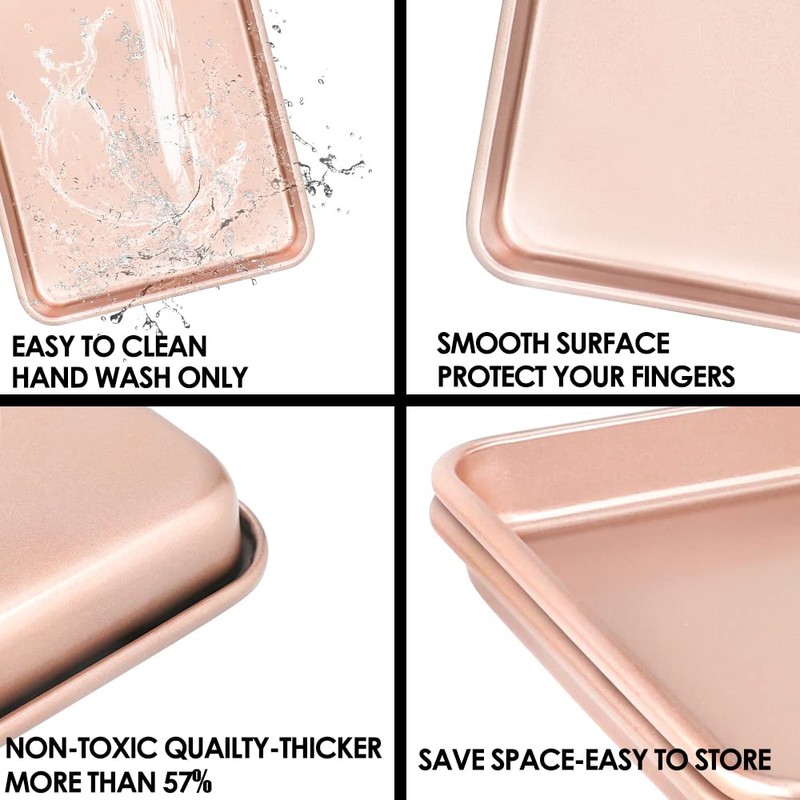 VERSATILE COOKIES PANS SET: Toaster oven pans are a versatile kitchen essential that will meet all your daily baking. Use them to make a variety of delicious treats, including butter cookies, chiffon cake, bread, pizza,ribs, roasts, turkey, and more. Baking tray is also a perfect size for baking cookies, pastries, lasagna,jelly rolls, pumpkins, chicken and vegetables.