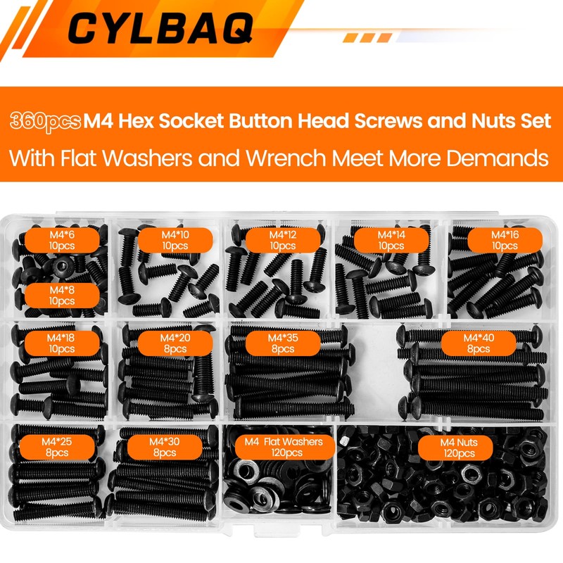 CYLBAQ 360pcs M4 Nuts and Bolts Assorted Set, 6mm to 40mm Metric Button Head Hex Socket Head Cap Screws Assortment Kit, Alloy Steel Machine Screws, Bolts, Nuts and Washers with Wrench
