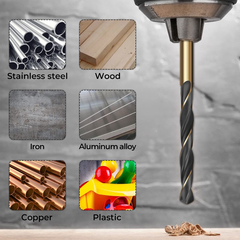 - đ«ăBrand New Upgrade MaterialăThis drill set is made of High-Speed Steel, 4341 High Quality Gold Titanium and Black Nitride Double Coating, enhance the surface hardness of the drill to improve machining accuracy, improve temperature resistance and wear resistance, performance and durability are proven.