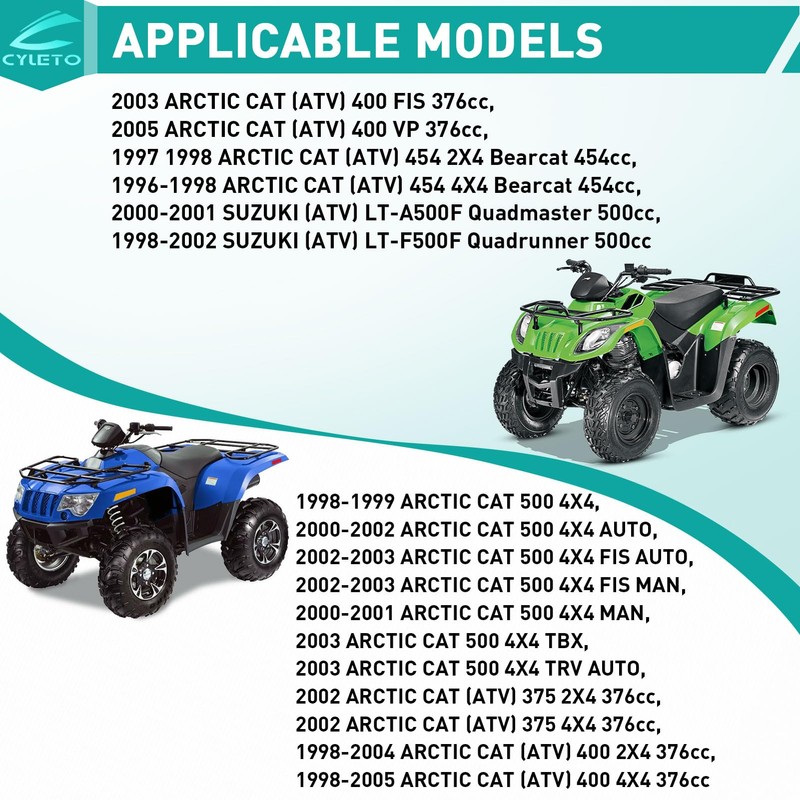 - FITMENT - 2003 ARCTIC CAT (ATV) 400 FIS 376cc,2005 ARCTIC CAT (ATV) 400 VP 376cc,1997 1998 ARCTIC CAT (ATV) 454 2X4 Bearcat 454cc,1996-1998 ARCTIC CAT (ATV) 454 4X4 Bearcat 454cc,2000-2001 SUZUKI (ATV) LT-A500F Quadmaster 500cc,1998-2002 SUZUKI (ATV) LT-F500F Quadrunner 500cc.