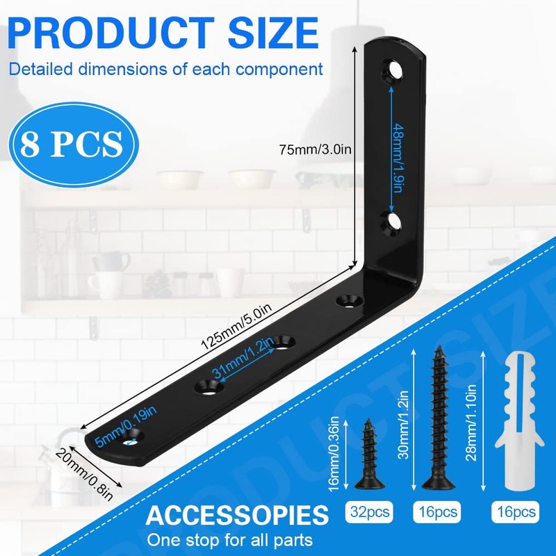 - 【Easily Attach Floating Shelves to the Wall】 Our heavy duty shelf bracket kit contains 8 L shaped shelf brackets, 16 expansion anchors and 48 screws (16 long, 32 short). These mounting accessories make it easy to attach the floating shelf to the wall, you just need to find the holes in the wood or the wall where you want to attach them, drive in the anchors and tighten the screws.