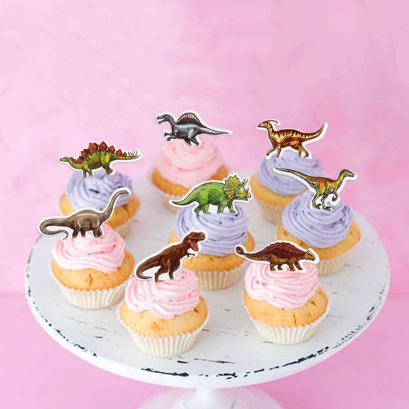 - Material:Edible dinosaur cupcake toppers is made of edible wafar paper which is non-toxic and safe to food, lightweight and portable, It's very convenient to put it on the cake.but not waterproof, will fade and soften when exposed to water