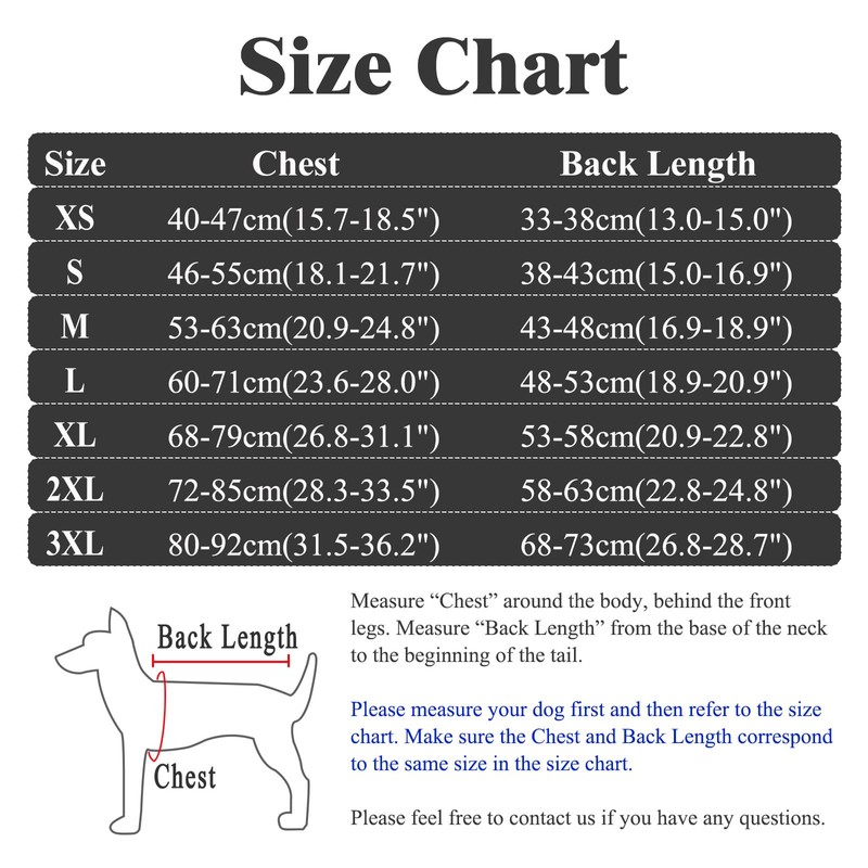 - About Sizes: Available in 7 sizes from XS to 3XL, this dog onesie is suitable for small, medium, and large dogs. Please measure your dog's chest and back length, then refer to our size chart to ensure the perfect fit. For any assistance, feel free to contact us.