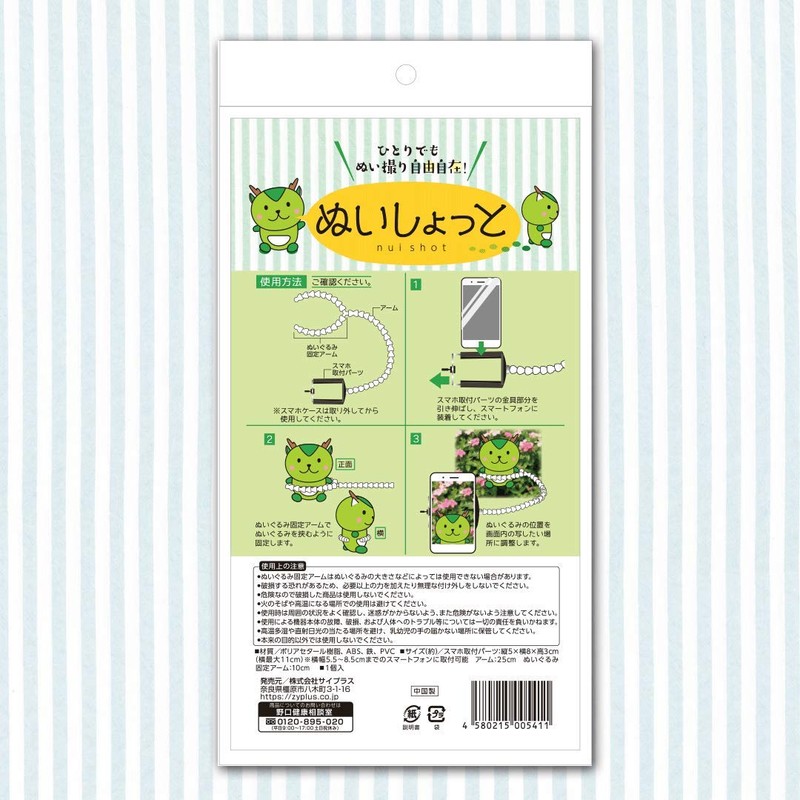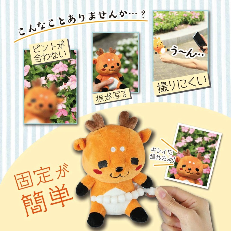 • ■ Size {(Approx.): Smartphone mounting parts: L 2.0 x W 3.1 x H 1.2 inches (5 x 8 x 3 cm) (maximum width 11 cm) *Can be mounted on smartphones up to 2.2 - 3.3 inches (5.5 - 8.5 cm). ■ Arm: 9.8 inches (25 cm) Plush fixed arm 3.9 inches (10 cm) (stuffed animal weight up to about 4.2 oz (120 g)