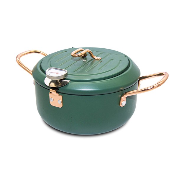 Cyrder Japanese Tempura Deep Fryer Pot with Fahrenheit Thermometer 2.3L- Nonstick Carbon Steel Oil Fryer, Fried Tempura/Chicken/Fish/Shrimp, Easy Clean, Green Tempura Pan, 8.2inch