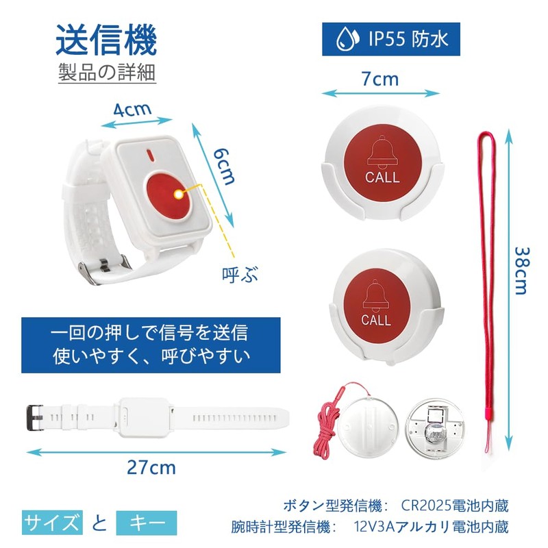 • Keep ringing: This nursing buzzer can be set to sound at all times, so you will never miss an emergency call from seniors or sicks. There are 20 different calling sounds and 4 levels of volume control (no noise cancellation) You can set different calling sounds for different buttons and watches. Also, the button and watch are IP55 waterproof