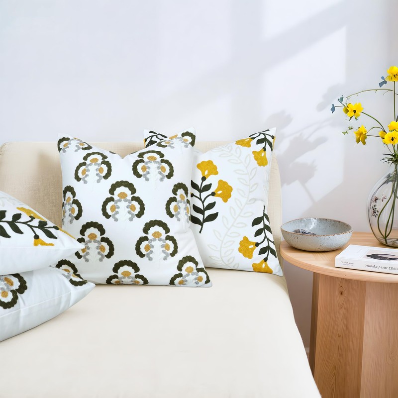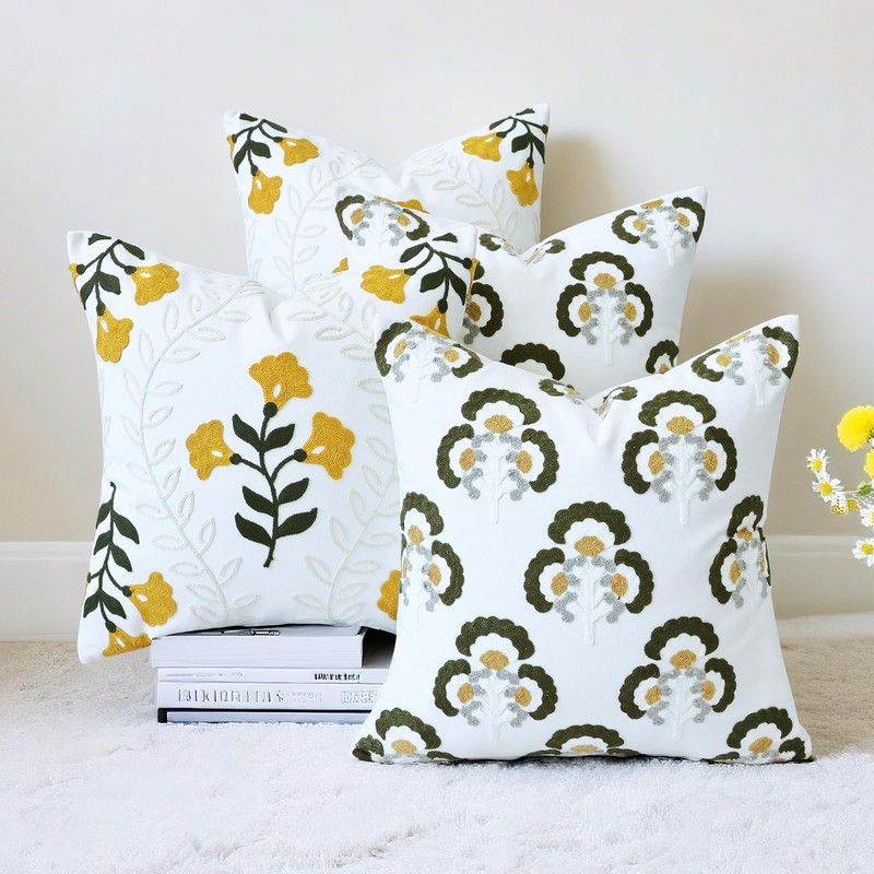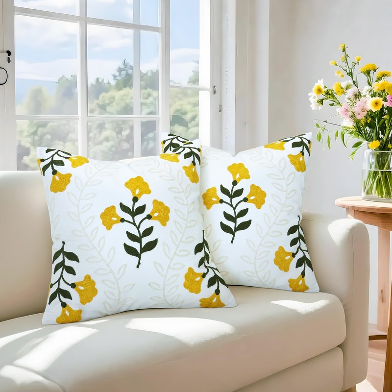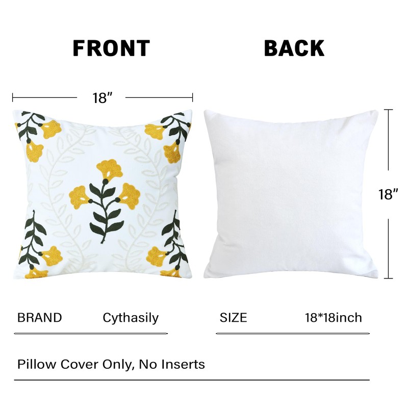- Exquisite Embroidery & Floral Design: This embroidered pillow covers features delicate chain embroidery in a charming pattern of yellow flowers and green foliage; The neutral base and pattern make this throw pillow easy to coordinate with any interior style; Whether your home is modern, bohemian, farmhouse, country, or traditional, it will blend in and enhance the overall aesthetic