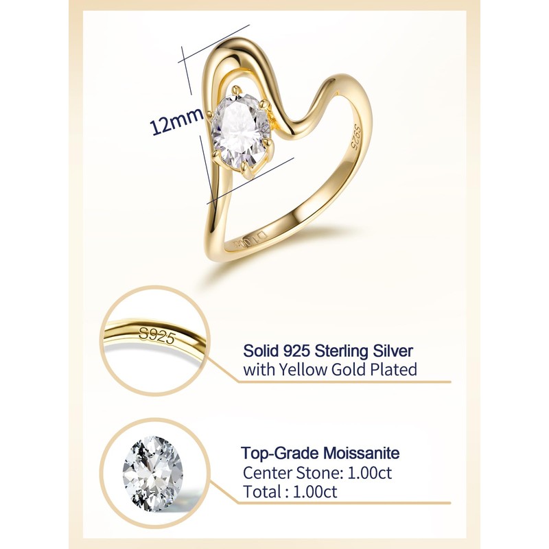 CYW Gold Plated Sterling Silver Moissanite Oval Wave Ring Size 10 for Women Hypoallergenic