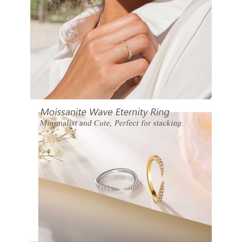 - 【Moissanite Wave Ring】 a Quiet Tide of Light that Circles the Finger, Whispering, Always. Moissanite Size and Quantity: 1.9mm*1.9mm*2pcs, 1.8mm*1.8mm*2pcs, 1.6mm*1.6mm*2pcs, 1.4mm*1.4mm*2pcs, 1.1mm*1.1mm*2pcs, 0.9mm*0.9mm*2pcs, Total Moissanites Weight: 0.18 Carat.