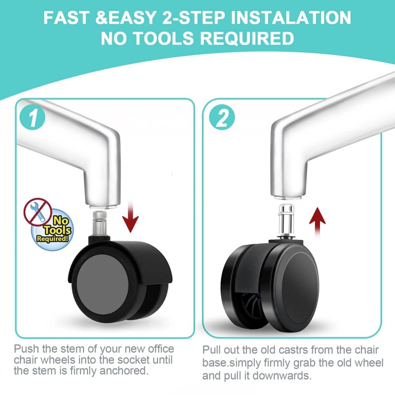 Easy to Install and Durable -- CYX Office chair casters replacement without any tools, just pull out the old office chair casters and push the new desk chair wheels in to the socket of the roller chair successfully. At the same time, our transparent polyurethane chair casters are more resistant to acid, grease, water and certain chemical substances, so that the chair casters for hardwood floors have a longer service life