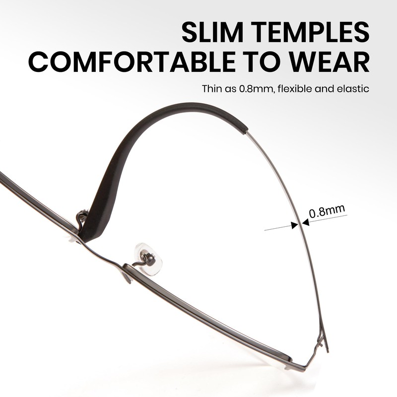 - Screwless frame: By eliminating the hinge, we have created a shape that naturally clings to your head. The fit is excellent and it does not slip off so quickly so no pain in the ears or temples even during prolonged wear