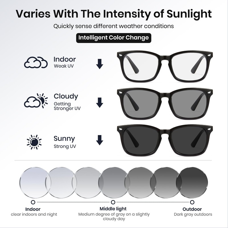 - Photochromic Lenses: Our lenses automatically adjust to changing light conditions, making them perfect for outdoor activities and transitioning between indoor and outdoor environments.
