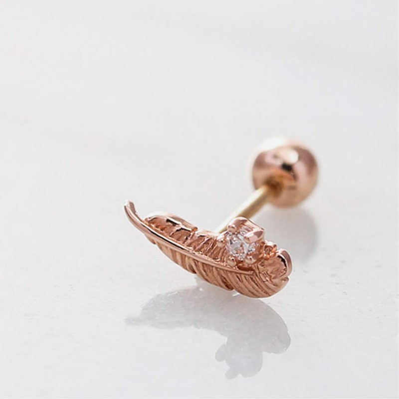 CZ Feather Tiny Cubic Zirconia Stud Earrings for Women Dainty Sterling Silver Cartilage Small Hypoallergenic Cute Tragus Helix Personalized Mini 20g Screw Back Studs for Daughter Bff (Rose Gold)