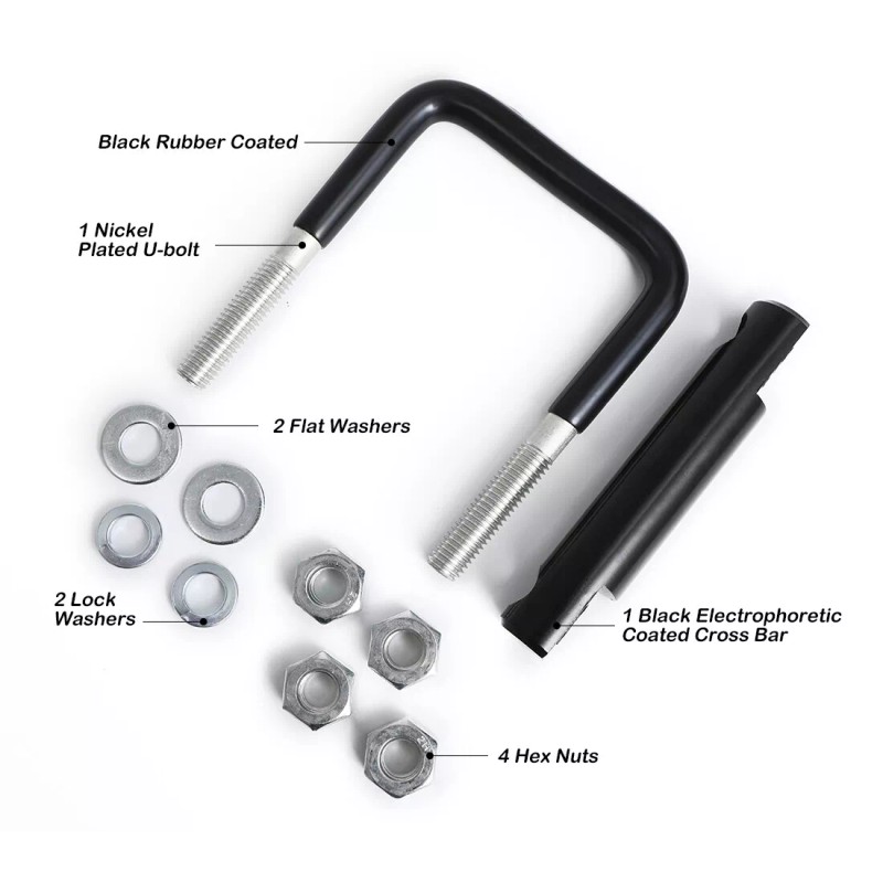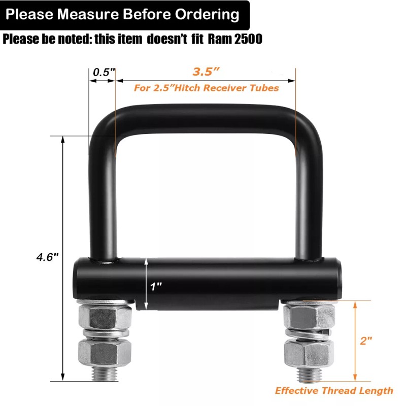 - Firm & Solid Hitch Coupling Clamp for Long Term Service- Made of high strength steel, the tightener fits for all weather condition. Nickel plated U-bolt and black electrophoretic coated cross bar are perfect for anti-corrosion. Part of the U-bolt is also rubber coated which can decreases more noise and add more friciton to keep it stay. Zinc-coated 4 hex nuts, 2 flat washers, 2 spring washers help to tighten the 2.5 inch cross hitch clamp in place and secure your towing.