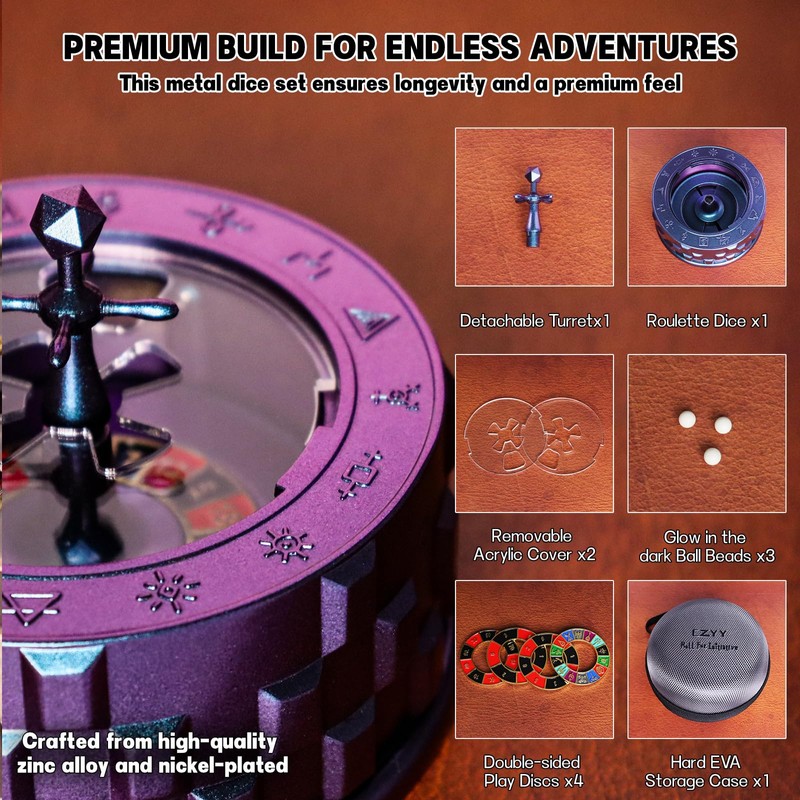 Tired of boring, predictable dice rolls ruining your tabletop gaming experience? Enter the CZYY Roulette Dice C a game-changer in the world of tabletop RPGs and Dungeons & Dragons. Designed for gamers who crave excitement, randomness, and fairness, this roulette dice set is the ultimate solution for your gaming needs.Inspired by the thrill of casino roulette, the CZYY Roulette Dice brings the electrifying essence of gambling right to your tabletop. Crafted from high-quality zinc alloy and nickel-plated for durability, this metal dice set not only looks stunning but is built to last through countless adventures.Whether you're on a flat surface or a tilted plane, the gyroscope maintains perfect balance, ensuring that every roll is truly random. Say goodbye to biased results and hello to a new level of fairness in your games.Featuring four detachable and double-sided play discs, you can seamlessly switch between various dice types C D4, D6, D8, D10, D12, D100, D20 C and even use the D&D Class Selector.But that's not all C the CZYY Roulette Dice is also a stylish desk fidget spinner and desktop anxiety relief gadget. It's not just a dice set; it's a unique dice experience that combines functionality with fun.In the box, you'll find everything you need for endless adventures:- 1 x Roulette Dice Base- 4 x Double-sided Play Discs (D4, D6, D8, D10, D12, D100, D20, and D&D Class Symbols)- 2 x Removable Acrylic Cover- 1 x Detachable Turret- 3 x Glow-in-the-dark Ball Beads- 1 x Hard EVA Storage CaseUpgrade your gaming experience with the CZYY Roulette Dice C the ultimate combination of a spin dice, spinner dice set, and tabletop gaming dice. Make every roll an event and turn stress into excitement with a quick spin. Don't settle for ordinary; choose the CZYY Roulette Dice and bring the thrill of the casino to your next game night!