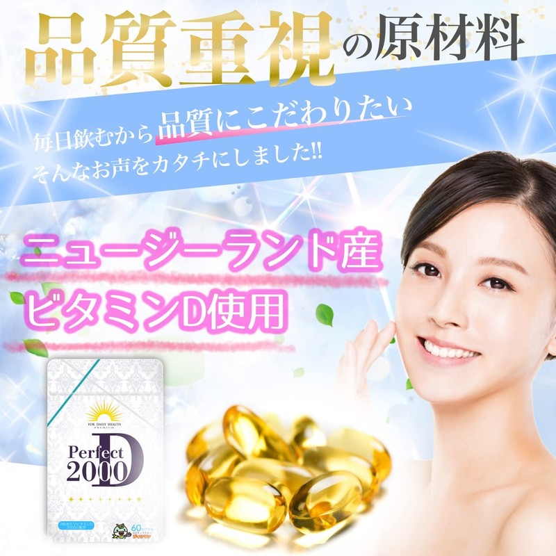• ✅【❗パーフェクトD2000はニュージーランド産のビタミンD3を2000IU配合❗】ビタミンDには主にビタミンD2とビタミンD3の2種類がありますがビタミンD2は植物に、ビタミンD3は動物に多く含まれます。本製品のビタミンDはニュージーランド産のビタミンD3を使用しており、1粒あたり1000IUのビタミンD3を摂取することが可能です。