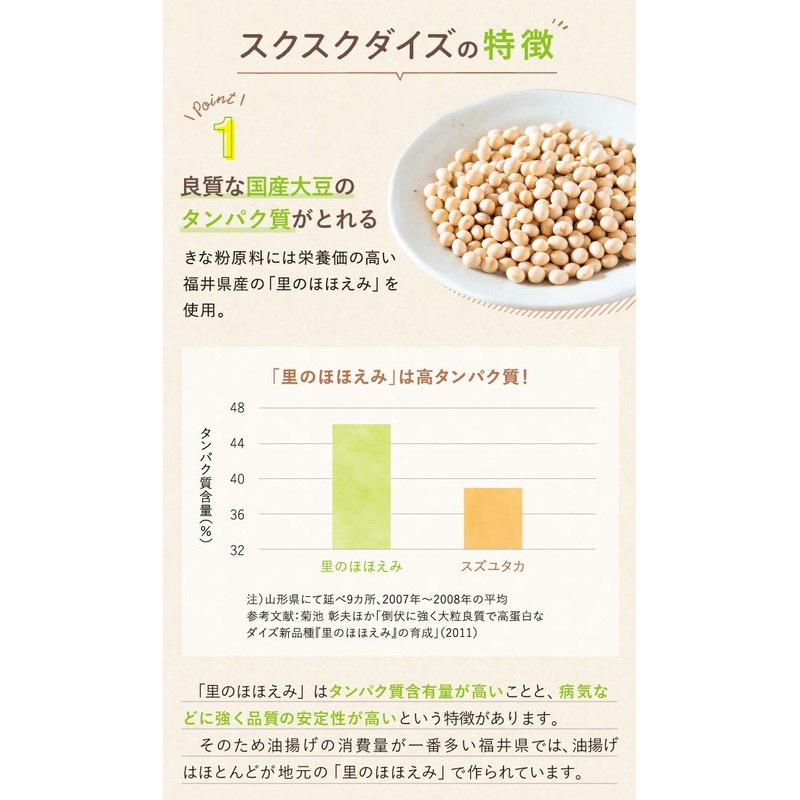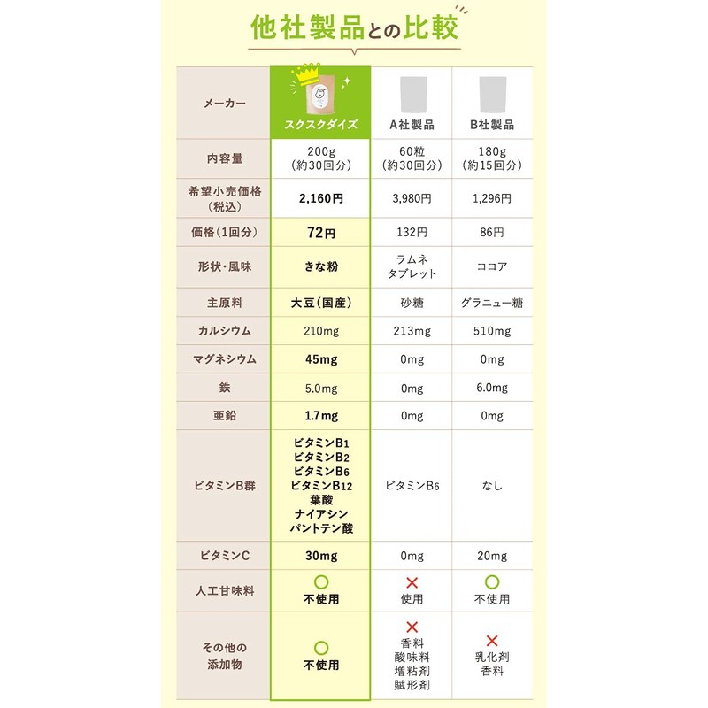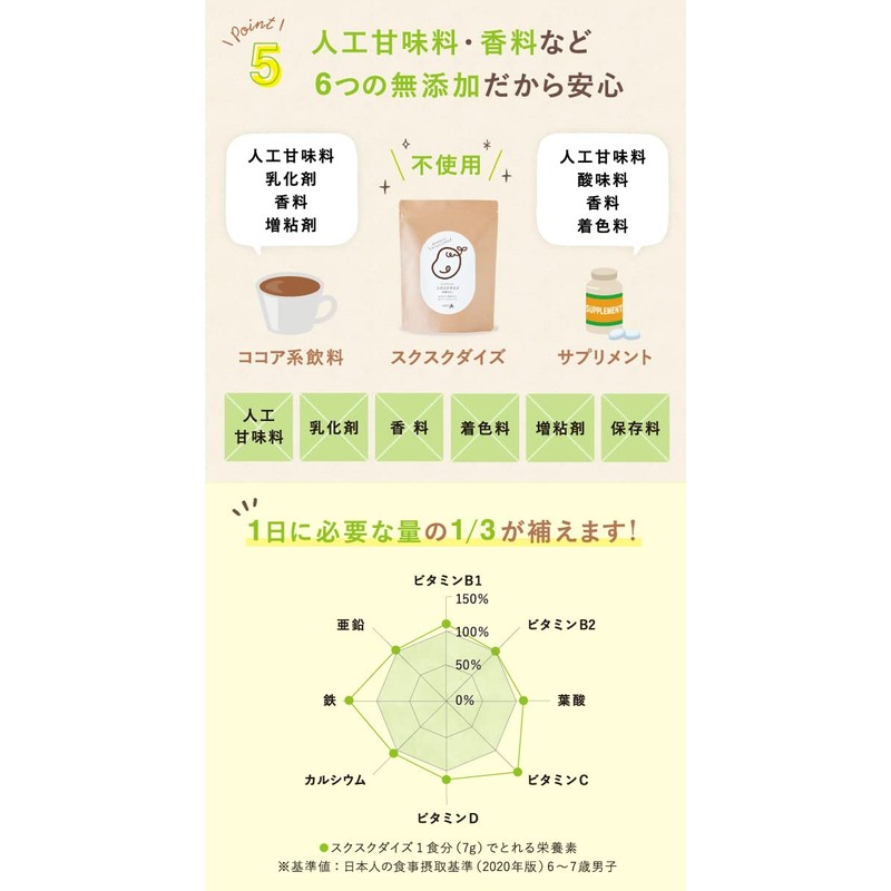 - 【赤ちゃんや幼児にも安心の 無添加 】従来のココア系飲料やサプリメントには人工甘味料・乳化剤・香料・着色料などの添加物は何かしら含まれていますが、「スクスクダイズ」にはいずれも不使用。離乳食にもご利用頂けます。