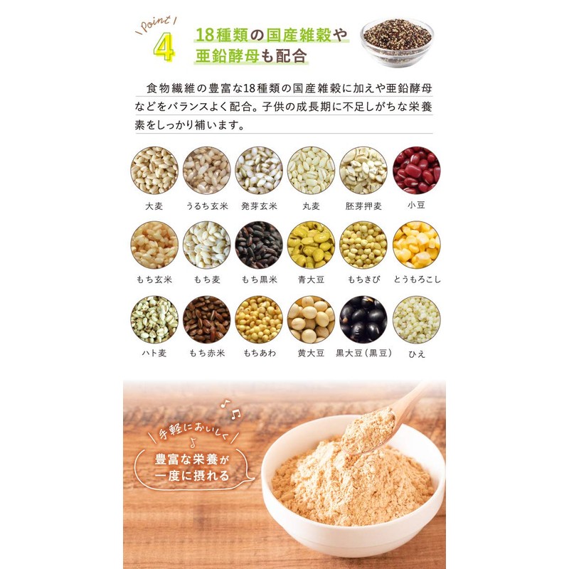 - 【18種の国産雑穀や亜鉛 】食物繊維の豊富な18種類の国産雑穀に加え亜鉛酵母などをバランスよく配合。ビタミンDや鉄分、マグネシウムも豊富で、偏食・少食の子供の栄養補助にも役立ちます。