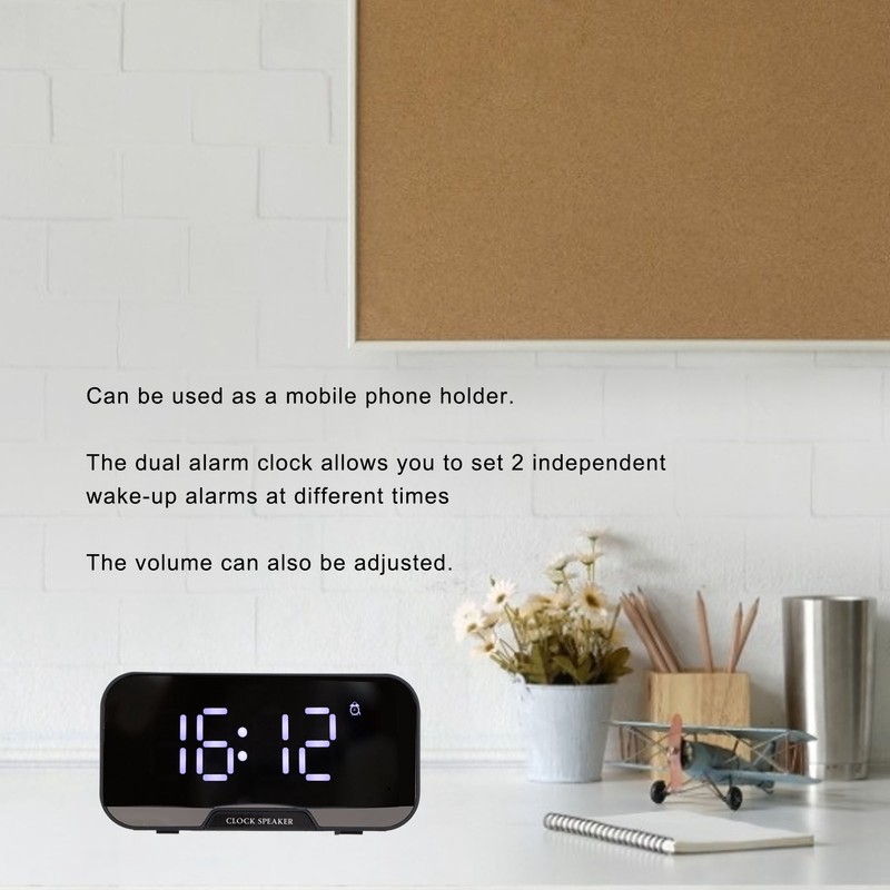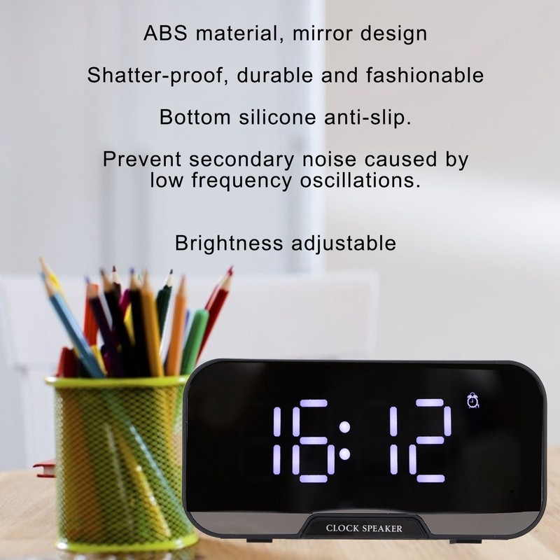 1、ABS material, mirror design, drop proof, durable and fashionable. The bottom silicone is non slip. Prevent secondary noise caused by low frequency oscillation. 2、Not only Bluetooth speakers, but also mirror design, Bluetooth, adjustable brightness, display clock, dual alarm clocks, and temperature. Can be used as a mobile phone holder. 3、Support Bluetooth 5.0 technology, compatible with all Bluetooth connected devices, enjoy music anytime, anywhere. The bass and large diaphragm speakers create a three-dimensional and powerful bass effect. 4、Supports three different brightness adjustments, reading before going to bed, and sleeping with you after going to bed; the brightness can be adjusted flexibly. The brightness adjustment is just right. 5、In addition to listening to music, it also increases the pleasure of hearing. Listening to your favorite radio stations, current events and funny jokes in your free time will add to your fun.