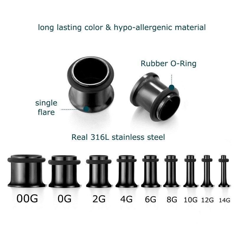 - Sizes: 14G/1.6mm, 12G/2mm, 10G/2.4mm, 8G/3.2mm, 6G/4mm, 4G/5mm, 2G/6mm, 0G/8mm, 00G/10mm - 4 pcs of each size