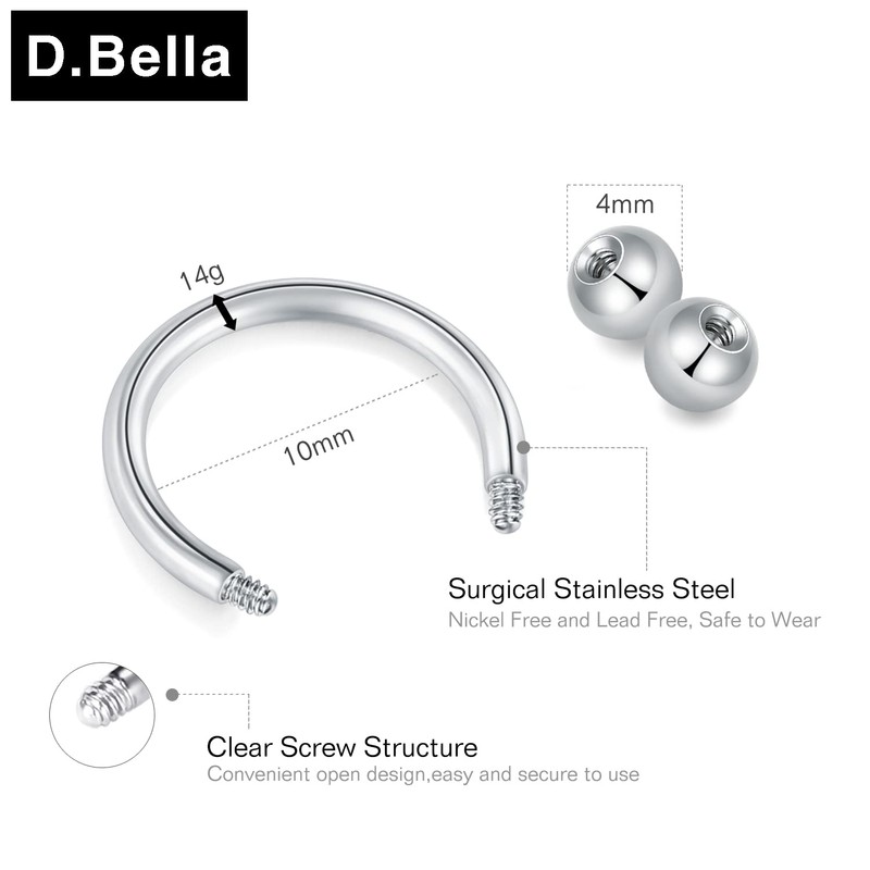 D.Bella 22G 20G 18G 16G 14G 12G 10G 8G 6G 4G 2G 0G 00G Surgical Steel Nose Septum Horseshoe Hoop Eyebrow Lip Navel Belly Nipple Piercing Ring Helix Tragus Daith Rook Captive Earrings Replacement