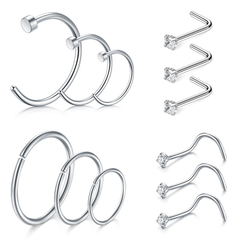 - [Total 14pcs] * 3pcs silver nose ring C shaped : 18 gauge (1.0mm), Inner Size is 5/16" (8mm), 3/8" (10mm),1/2"(12mm) * 3pcs silver Hoop Nose Ring: 18 gauge(1.0mm), Diameter is 5/16" (8mm), 3/8" (10mm),1/2"(12mm) * 3pcs silver L shaped nose stud: 18 gauge(1.0mm), Length 9mm, diamond stone's diameter 2mm.* 3pcs silver nose screws: 18 gauge(1.0mm), Length 9mm, diamond stone's diameter 2mm.