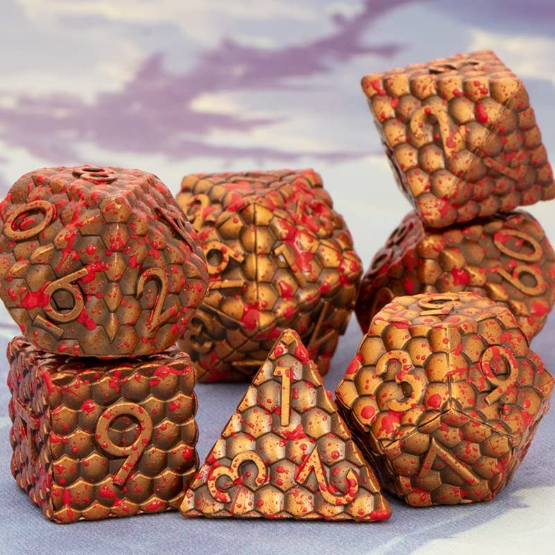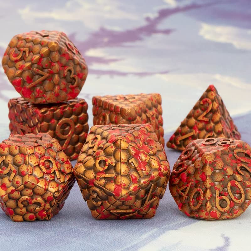 D&D Dice Set DND Dice, KERWELLSI Honeycomb Design Metal Polyhedral Dice Set with Box, Cool D+D Role Playing Game Dice D20 D12 D10 D8 D6 D4 for MTG, Pathfinder (Ancient Gold with Blood Splash)