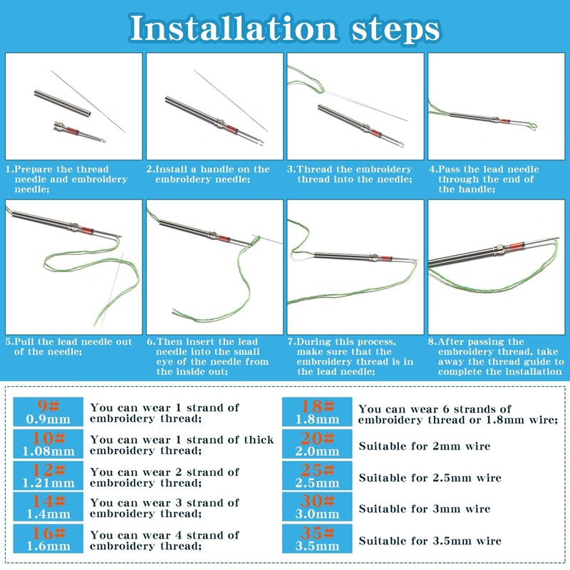 - 10 SIZES -- Embroidered Punch Needles are available in 10 sizes #9, #10, #12, #14, #16, #18, #20, #25, #30, #35. 7 sizes (#9, #10, #12, #14, #16, #18, #20) are small enough to fit a blue non-slip or regular handle regardless of size. 3 sizes (#25, #30, #35) are large and have an unremovable soft grip for multi-strand embroidery threads