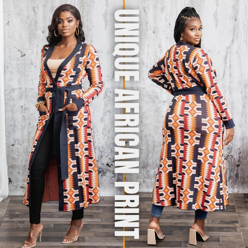 D'IYANU | Aisha Women's African Culture Print Cardigan or Dress | Traditional Ankara Pattern | Cream Orange Kente | Versatile Calf-Length with Contrast Belt | L