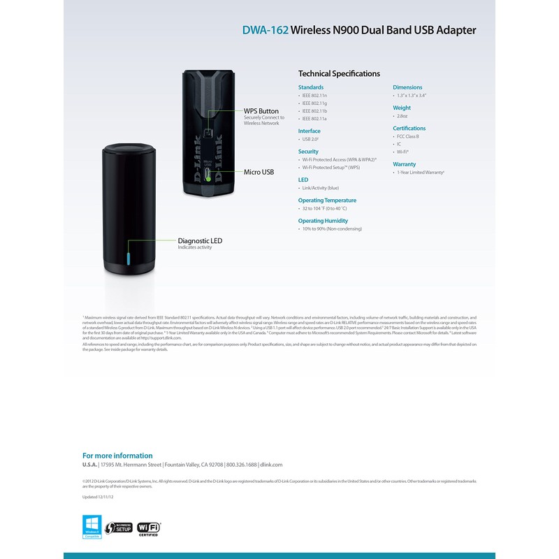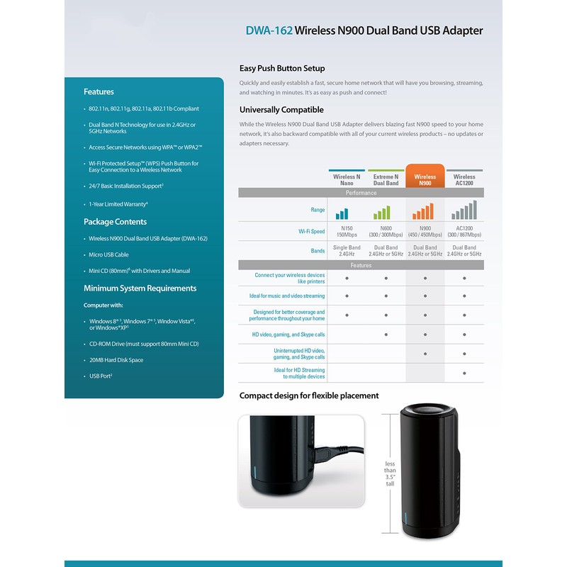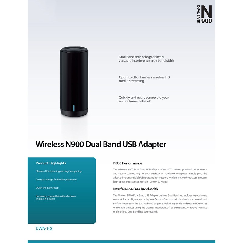 D-Link Wireless Dual Band N-900 Mbps USB Wi-Fi Network Adapter (DWA-162)