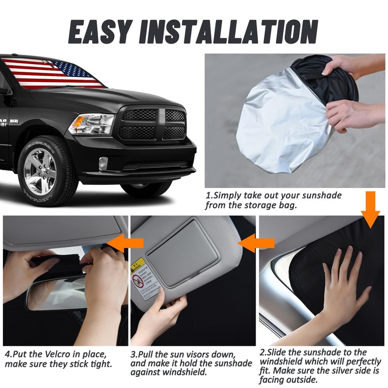 - 【Customized Windshield Sun Shade】: Front windshield sunshade USA Flag for 2021 2022 2023 Ford F150 F-150 (Lariat, King Ranch, Platinum, XL XLT Limited Raptor). Double-layer design including black heat insulation layers and silver reflective layers, custom-fit sunshade to full cover your windshield.