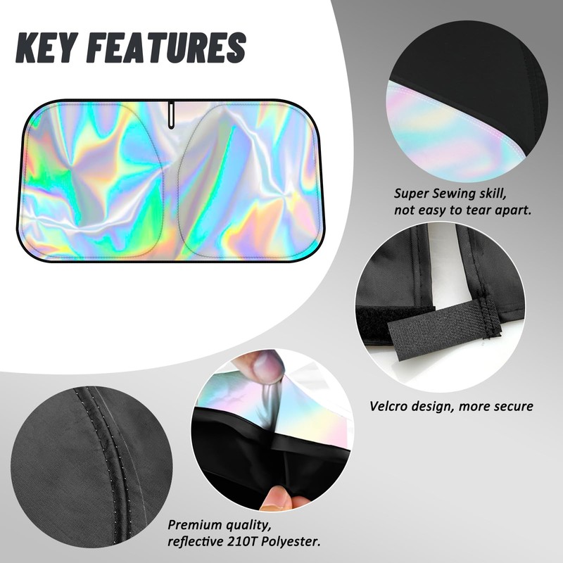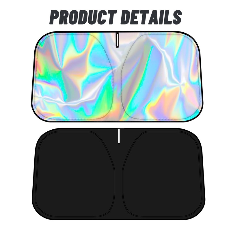 - 【Iridescent Reflective 300D Material】: D-Lumina windshield sunshade is made of iridescent reflective 300D fabric with UV reflective material, two-layer heat insulation and 99% SPF for better heat dissipation. Design to protect car seats, electronic parts, dashboard, steering wheel and other instruments to stay cool, fully shaded and no need to worry the high temperature in summer.