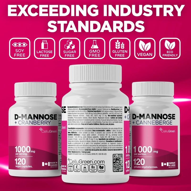 - CELLUGREEN’S D-MANNOSE AND CRANBERRY CAPSULES: containing 500mg of d-mannose powder are enriched with four potent natural extracts renowned for their ability to combat yeast. This powerful blend ensures effective results.