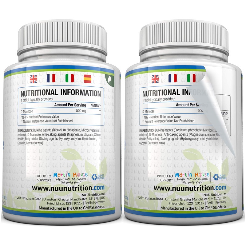 • ✔ A CONVENIENT & RELIABLE SOURCE OF D-MANNOSE - Our high strength tablets provide a dependable source of D-Mannose that is suitable for both Vegetarians and Vegans and is free from allergens including: milk, lactose, gluten, wheat, eggs, crustaceans, fish, nuts, seeds and mustard.
