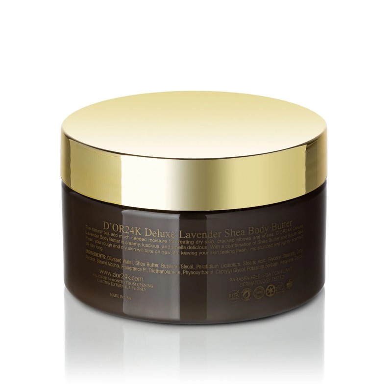 The natural oils add much needed moisture for treating dry skin, cracked elbows and knees. D'or 24K Body Butter (Lavender, Passion Fruit) is creamy, luscious and smell delicious. With a combination of Shea Butter and South Sea Pearl, your rough and dry skin will take on a new life, leaving it fresh, moisturized and lightly scented all day long.