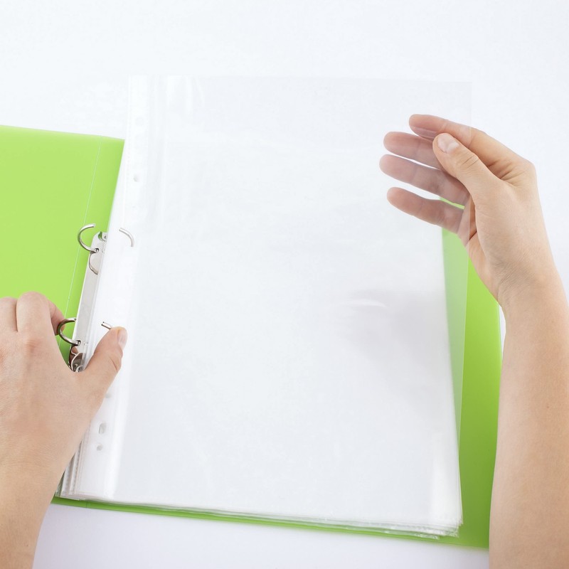 - The advantages at a glance: practical and transparent: the sleeves are transparent so you can see the contents immediately. SECURE PROTECTION Protect your documents from dirt, moisture and cracks. EASY ORGANIZATION Punched holes allow for filing in binders and binder folders