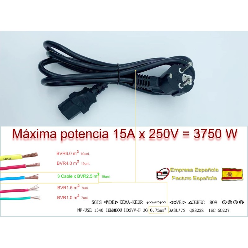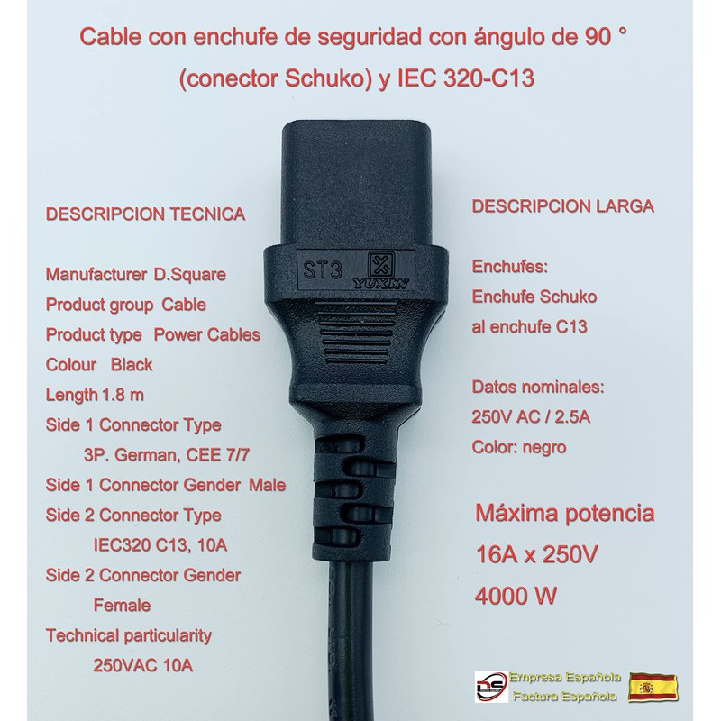 - Connector A: EU plug 7/4 connector B: IEC C13 plug cable: H05VV-F - 0.75 mm² insulation: PVC load capacity: 250 V, 10 A, 2500 W, inner conductor: copper (CU).