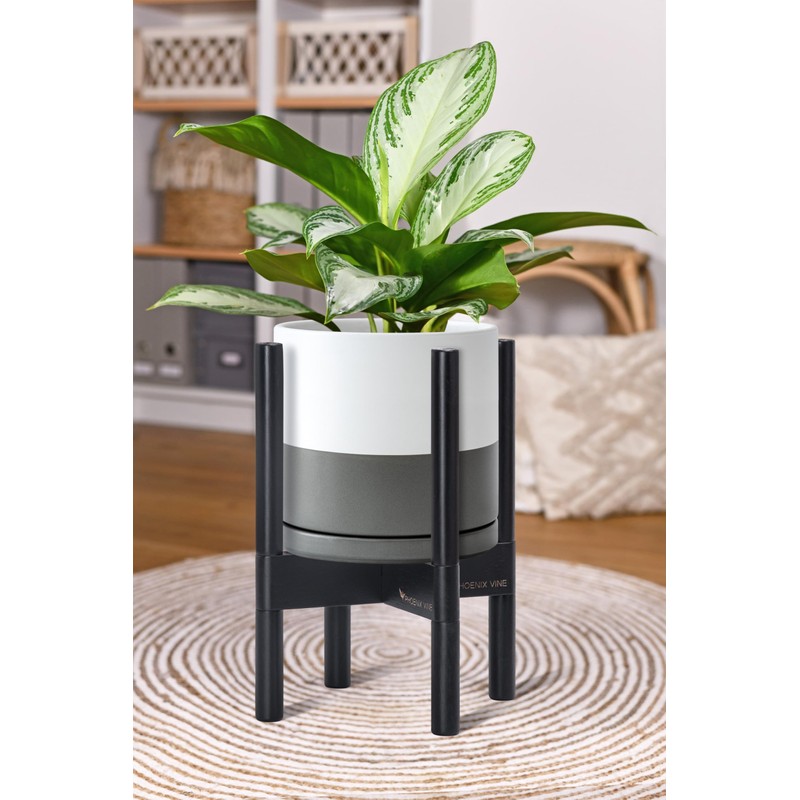 D'vine Dev Ceramic Planter with Ebony Stand - 8 Inch Modern Round Flower Pot with Wood Planter Holder, White/Grey, 55-B-M-6