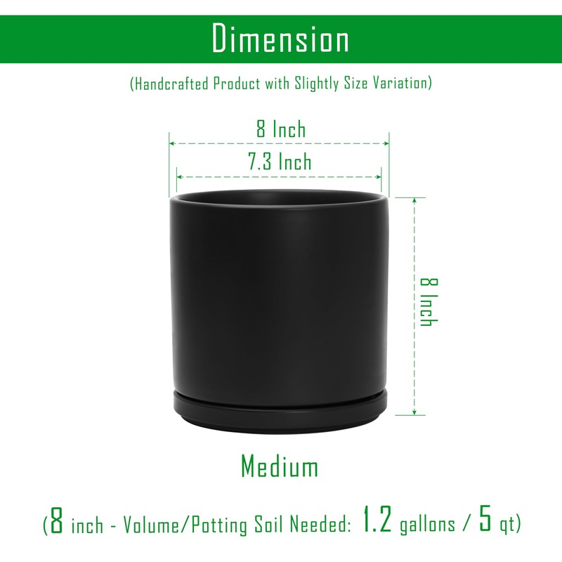 - Medium 8 Inch Planter Pot: 8" Diameter x 8" H, black color. Potting Soil Needed: 1.2 gallons / 5 qt.