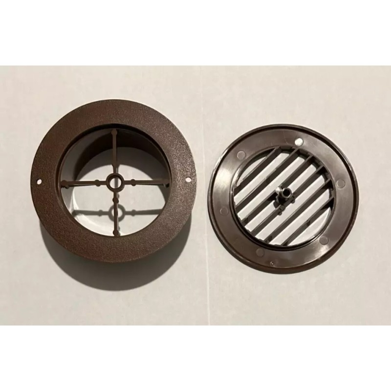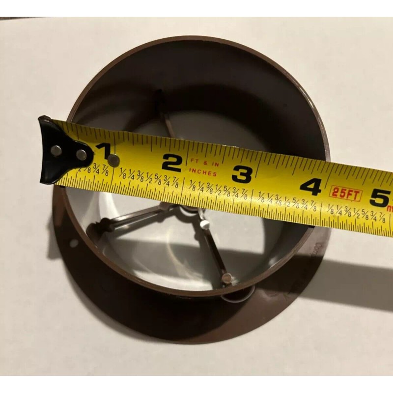 4" WALNUT Round Rotaire Grille Heat Covered Screws Outlet Vent 3940WN RV Trailer Two piece snap together design covers the 2 screw heads. 360 rotation, easy installation and long term durability. Accepts 4" flex duct. See tape measure pictures. Approximate size: Grille face diameter 5 1/2" Back diameter 4" Side: 2" Please let me know if you have any questions. Thank you, Babette |