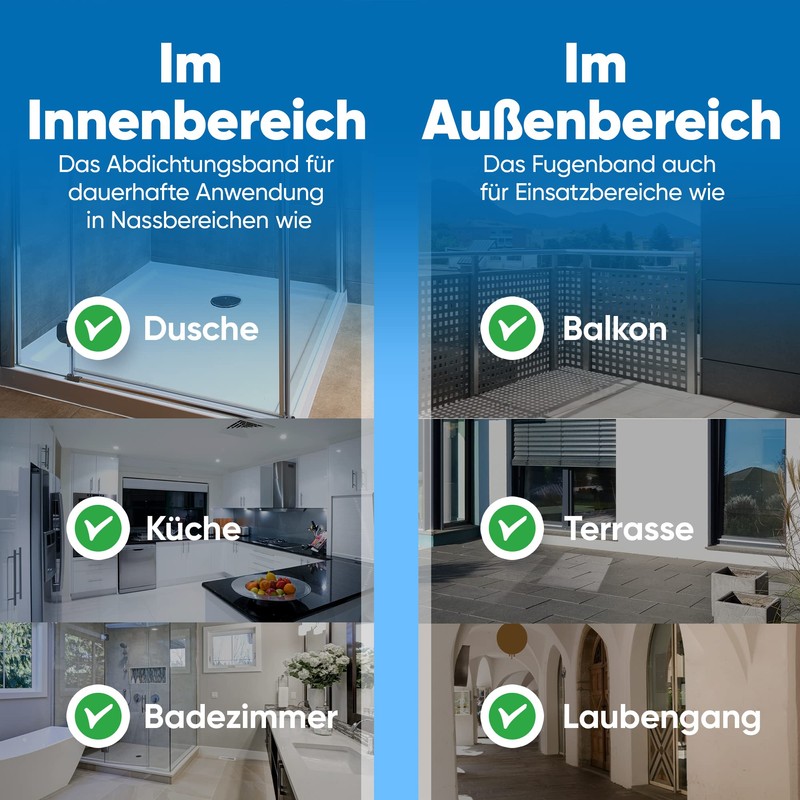 - Indoor use: the sealing tape for permanent use in wet areas such as showers, bathrooms and kitchens
