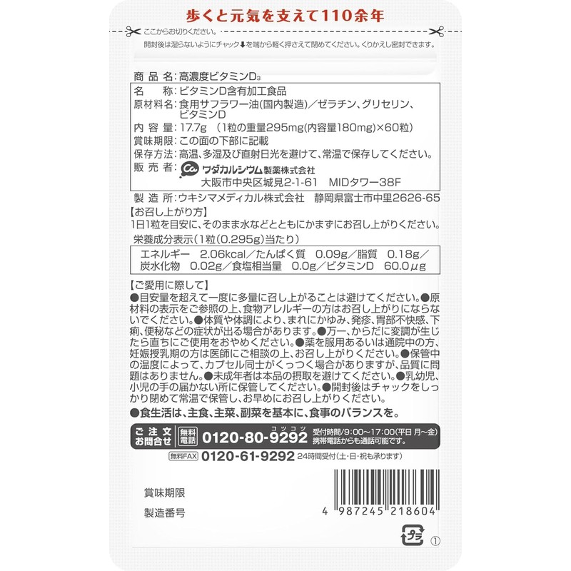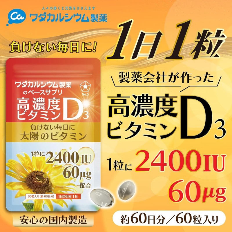 - ☀️【ビタミンD不足】現代社会において「※日本人の98%がビタミンD不足」とされています。(※2023年6月東京慈恵会医科大学 報道発表資料より) 食生活・生活様式の変化、美容目的で日光を避けたりする事が原因と言われています。そこで、1日1粒でお手軽に摂取可能なワダカルシウム製薬のベースサプリ「高濃度ビタミンD3」なら継続してビタミンD3の摂取が可能です。