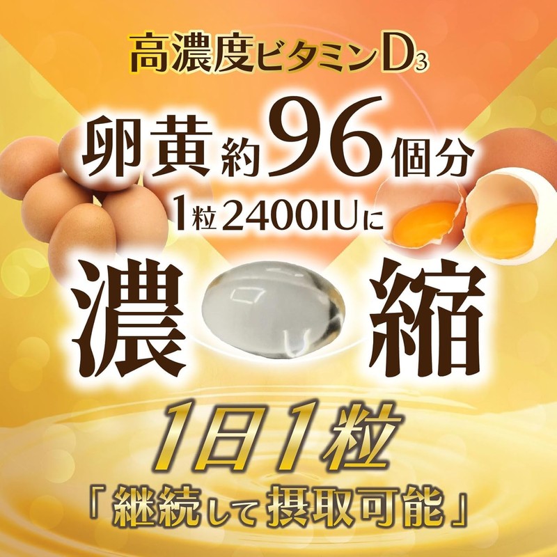 - ☀️【高濃度ビタミンD3】紫外線を浴びることが少ない方に不足しがちなビタミンDをお手軽に摂取ができるサプリメントです。1粒に2400IUを高濃度配合で「※卵黄約96個分」のビタミンD3を濃縮!(※卵黄1個のビタミンD3含有量25IUで算出)
