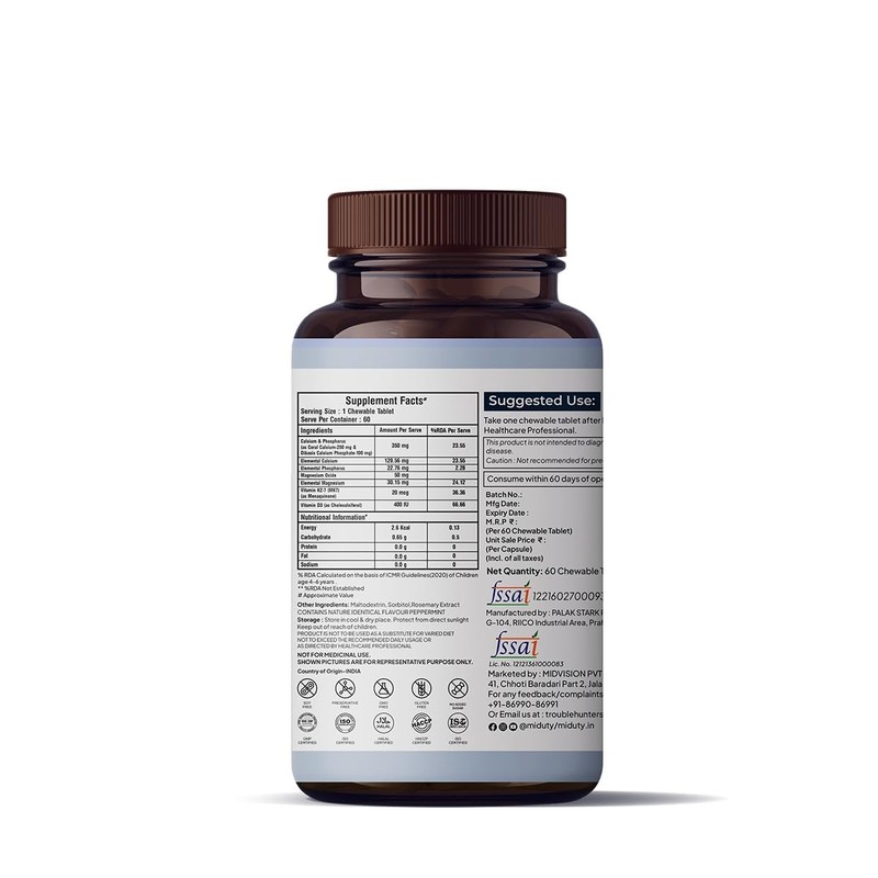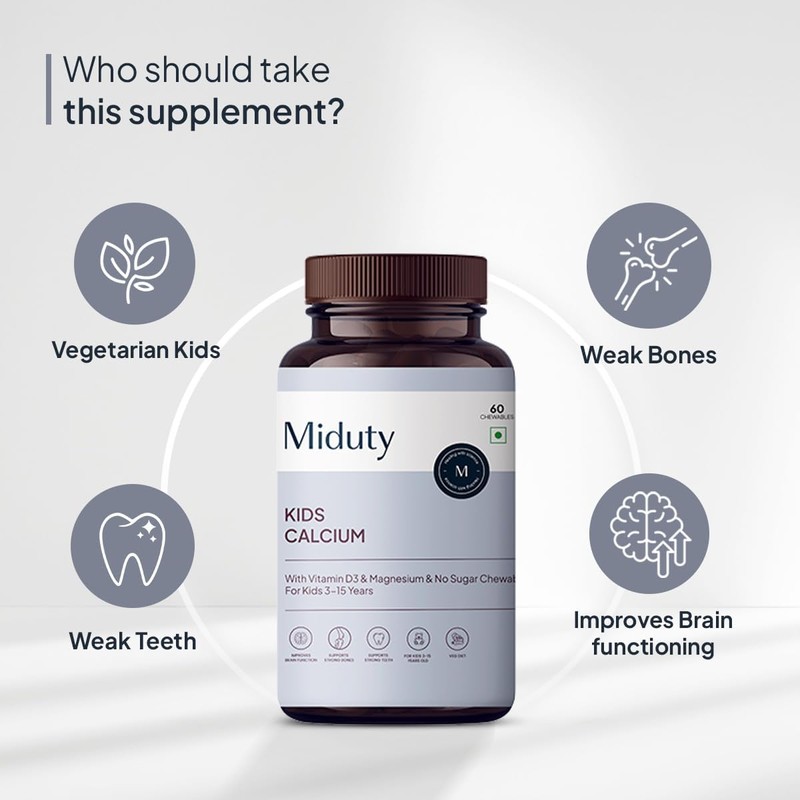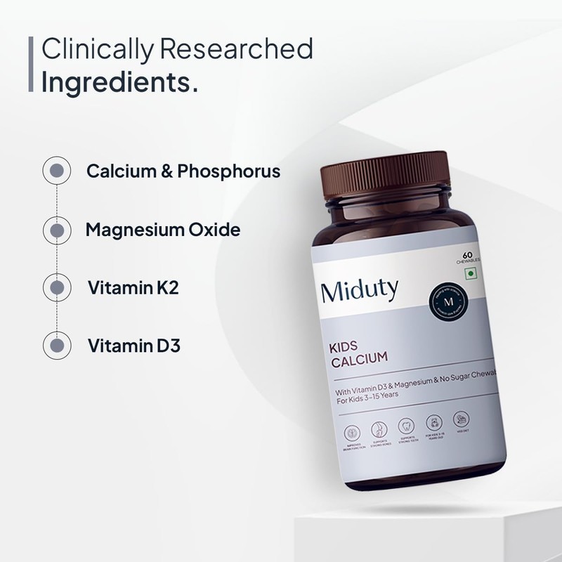 - Dosage- You are advised to take Miduty Kids Calcium 1 chewable after the meal for kids at 2-8 years of age and 2 chewables for 8-18 years of age group per day.