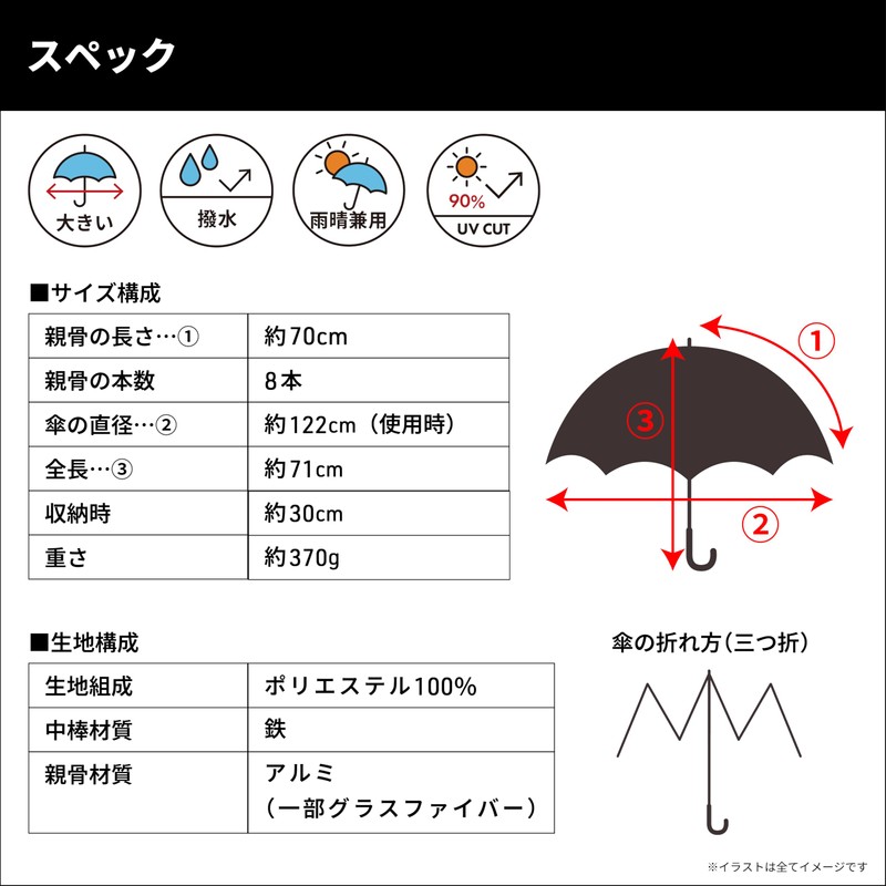 - Specifications: Umbrella Diameter: Approx. 48.0 inches (122 cm); Total Length: Approx. 28.0 inches (71 cm); When Stored: Approx. 11.8 inches (30 cm); Weight: Approx. 13.6 oz (370 g); Treatment: UV protection treatment, highly water repellent treatment that can also be used as a parasol. Note: *The shaft may have oil applied to improve the sliding parts. There may be individual differences, but if you are concerned about the oil, please wipe it off with a cloth before use