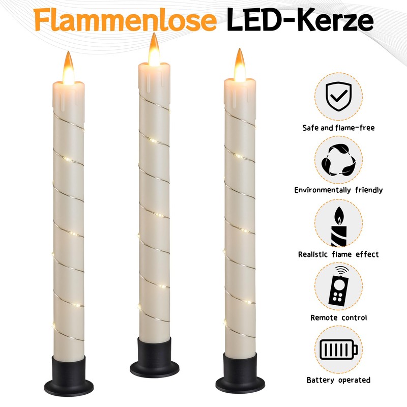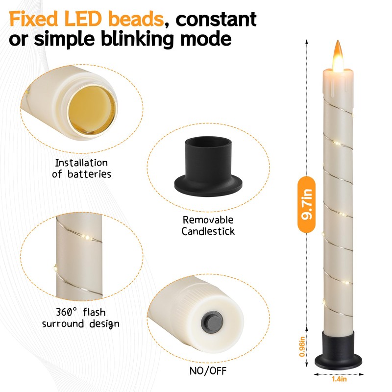 • Battery Operated Taper Candle : Powered by 2 AA batteries (not included), enjoy long - lasting illumination. Easy to install and replace, no electrical outlets needed.say goodbye to wax drips, smoke, and fire hazards. These flameless candles provide the beauty of real candles without any of the risks, perfect for homes with kids and pets