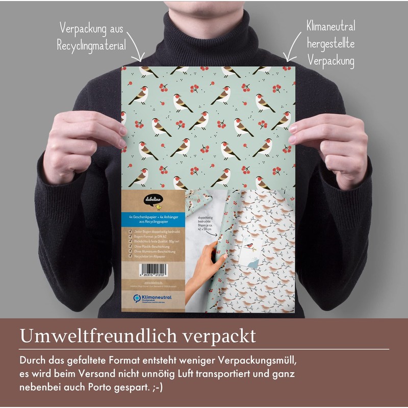 - dabelino Christmas wrapping paper birds/berries: 4 x sheets 4 x pendant set environmentally friendly, sustainable, eco-friendly, modern, elegant, recycled, for adults, birthdays